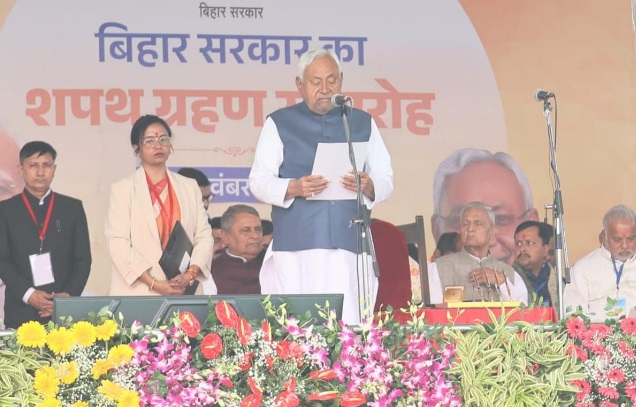 पटना : पटना के गांधी मैदान में नीतीश कुमार ने रिकॉर्ड दसवीं बार मुख्यमंत्री पद की शपथ ली. उनके साथ 26 मंत्रियों ने भी शपथ ली. इस मौके पर प्रधानमंत्री नरेंद्र मोदी, बीजेपी अध्यक्ष जेपी नड्डा, गृहमंत्री अमित शाह, आंध्रप्रदेश के सीएम चंद्रबाबू नायडू, यूपी के सीएम योगी आदित्यनाथ मौजूद थे.