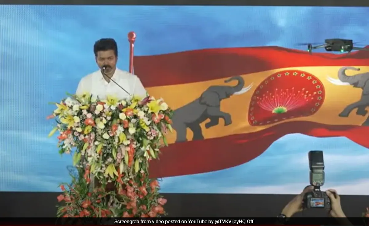 दो हफ्ते पहले ही एक्टर ने अपनी पार्टी के ध्वज और प्रतीक का अनावरण किया था. र्टी का झंडा ऊपर, नीचे लाल और मरून रंग का है. वहीं, बीच का रंग पीला है, जिस पर दो हाथी और एक वागई फूल बना हुआ है, जो जीत का सिंबल है. TVK ने पार्टी के सोशल मीडिया हैंडल पर अपना झंडा गान (Flag Anthem) भी लॉन्च किया था.