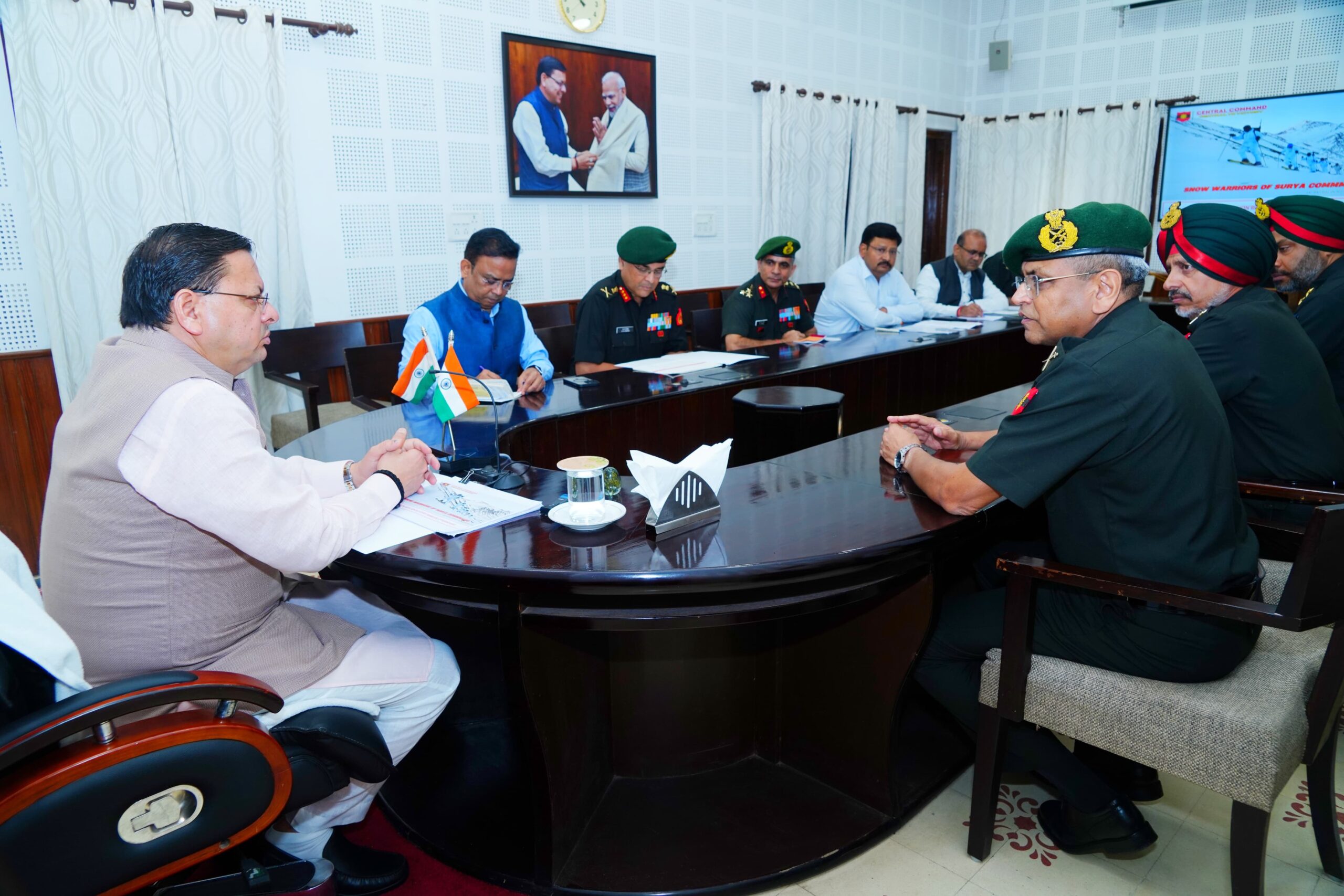 लेफ्टिनेंट जनरल अनिंद्य सेनगुप्ता ने मुख्यमंत्री को सीमांत क्षेत्रों के समग्र विकास हेतु मध्य कमान द्वारा संचालित कार्यक्रमों की जानकारी दी। उन्होंने बताया कि भारतीय सेना, सुरक्षा व्यवस्था के साथ-साथ सामाजिक विकास हेतु भी पूरी प्रतिबद्धता के साथ कार्य कर रही है। उन्होंने बताया कि सीमांत क्षेत्रों में बुनियादी ढांचे के विकास, सामुदायिक सहभागिता, युवाओं के साथ संवाद और अग्रिम क्षेत्रों में पर्यटन को बढ़ावा देने के लिए कई महत्वपूर्ण पहल की गई हैं।