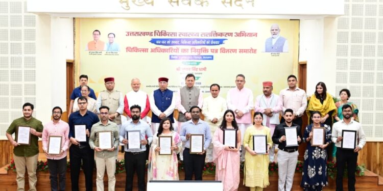 देहरादून: कवि गुमानी पंत की पंक्तियों को कोट करते हुए कहा- प्रथम देह को जतन कर लो, फिर साधना होगी।के अनुरूप चिकित्सकों को अपने ज्ञान और कौशल से लोगों के स्वास्थ्य को ठीक करने को कहा। मुख्यमंत्री पुष्कर सिंह धामी ने मुख्य सेवक सदन में स्वास्थ्य विभाग द्वारा आयोजित उत्तराखंड चिकित्सा स्वास्थ्य सशक्तिकरण अभियान में प्रतिभाग करते हुए 220 नव नियुक्त चिकित्सा अधिकारियों को नियुक्ति पत्र वितरित किए।