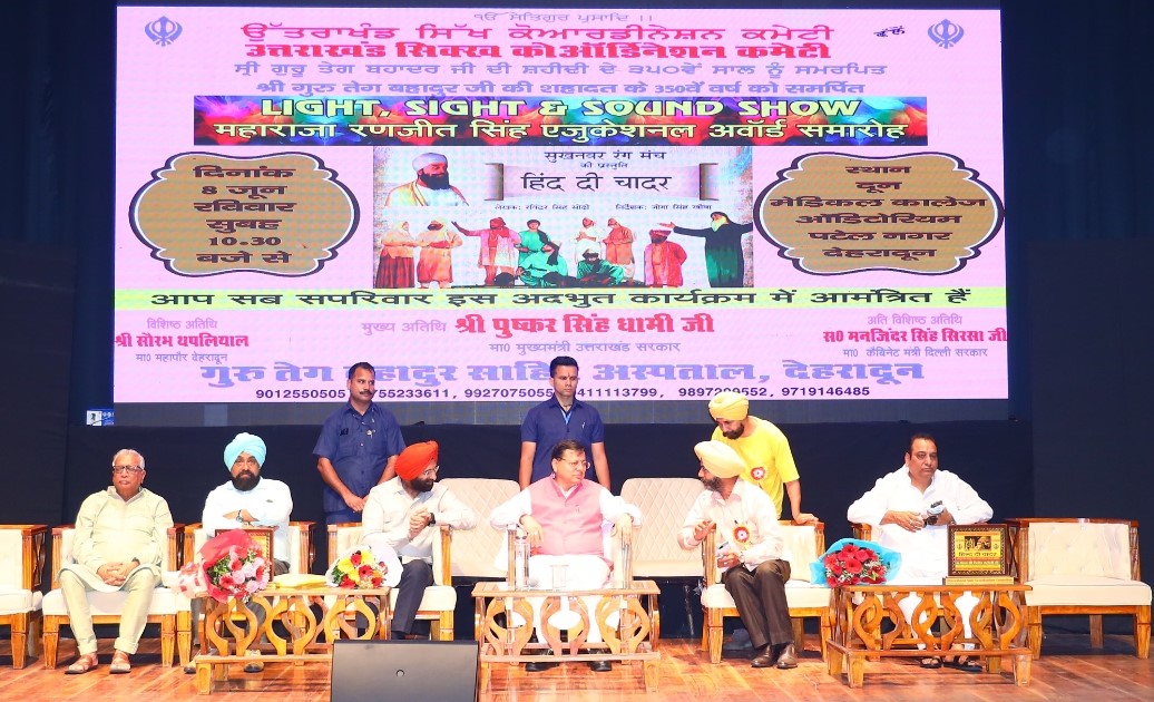 देहरादून : मुख्यमंत्री श्री पुष्कर सिंह धामी ने रविवार को गुरु तेग बहादुर जी के 350वें बलिदान वर्ष को समर्पित नाटक ‘हिन्द दी चादर’ के मंचन कार्यक्रम में प्रतिभाग किया। उत्तराखण्ड सिक्ख कोऑर्डिनेशन कमेटी एवं श्री गुरू तेग बहादुर चैरिटेबल चिकित्सालय द्वारा नाटक ‘हिन्द दी चादर’ का मंचन कार्यक्रम दून मेडिकल कॉलेज, पटेलनगर देहरादून में किया गया।