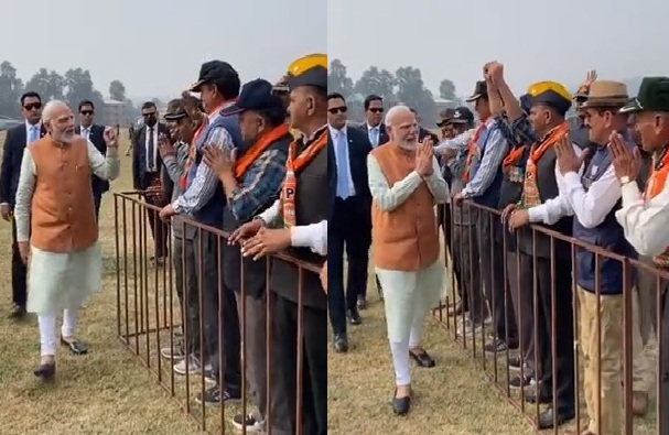 शिमला: हिमाचल प्रदेश में 12 नवंबर को होने वाले विधानसभा चुनाव से ठीक पहले प्रधानमंत्री नरेंद्र मोदी आज यानी बुधवार को दो जनसभाओं को संबोधित करने हिमाचल पहुंचे हैं. कांगड़ा के चंबी में रैली को संबोधित करने के बाद पीएम मोदी जब एक और जनसभा को संबोधित करने हमीरपुर के सुजानपुर पहुंचे तो वहां मौजूद सेना के पूर्व जवानों ने उनका जोरदार स्वागत किया, जिसका वीडियो सोशल मीडिया पर तेजी से वायरल हो रहा है.