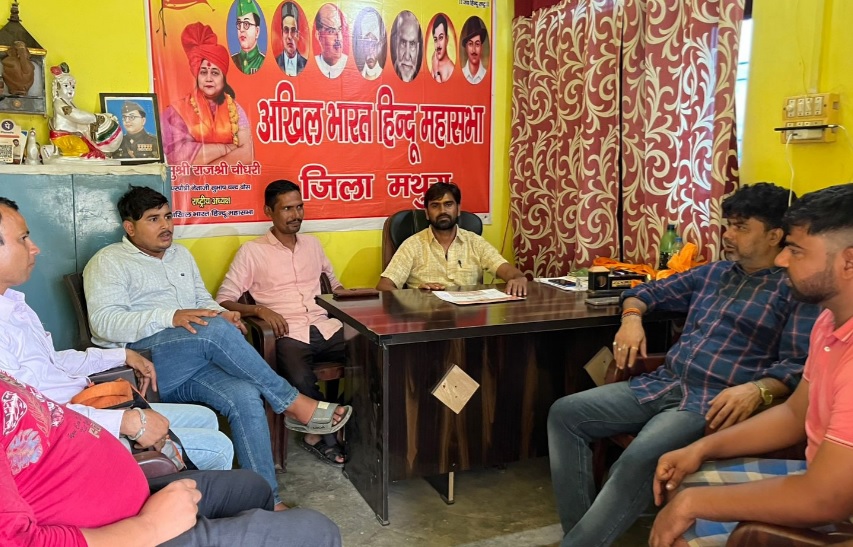 मथुरा: अखिल भारत हिंदू महासभा की मासिक बैठक शहर स्थित कैंप कार्यालय में आयोजित की गई। राष्ट्रीय अध्यक्ष राजश्री चौधरी ने वीडियो कॉलिंग कर बैठक में कहा मालेगांव बम विस्फोट मामले में एनआईए कोर्ट द्वारा दिए गए फैसले का स्वागत किया गया और महिलाओं के सम्मान से जुड़े मुद्दों पर भी तीखी प्रतिक्रिया दी गई। बैठक की अध्यक्षता मथुरा कार्यकारी जिला अध्यक्ष राजवीर दीक्षित के नेतृत्व में की गई। उन्होंने बैठक की शुरुआत सभी को मिठाई खिलाकर की और शुभकामनाएं देकर की।
