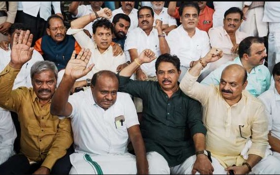 राज्य के पूर्व सीएम बासवराज बोम्मई ने भाजपा विधायकों के निलंबन पर कहा कि ‘यह लोकतंत्र का काला दिन है। आज लोकतंत्र की हत्या हुई है। सिर्फ छोटे से विरोध प्रदर्शन के लिए उन्हें (10 भाजपा विधायकों) निलंबित कर दिया गया। हम निलंबित विधायकों के अधिकार के लिए लड़ेंगे।’ पूर्व सीएम बोम्मई ने बाद में विधानसभा के बाहर धरना प्रदर्शन भी किया, जिसके बाद पुलिस ने बोम्मई को हिरासत में ले लिया।
