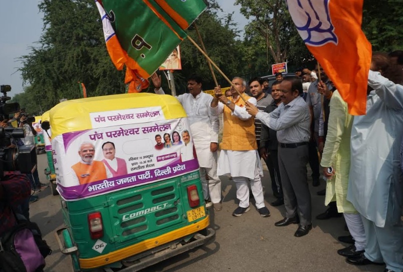 नई दिल्ली। भारतीय जनता पार्टी के प्रदेश अध्यक्ष आदेश गुप्ता ने 16 अक्टूबर को रामलीला मैदान में विशाल पंचपरमेश्वर सम्मेलन को लेकर 200 से अधिक ऑटो रिक्शा को प्रचार के लिए हरी झंडी दिखाकर रवाना किया। 16 अक्टूबर को होने वाले कार्यक्रम के प्रचार के लिए ये सभी ऑटो रिक्शा दिल्ली के सातों लोकसभाओं में घूमेंगे। आदेश गुप्ता के साथ पूर्व केंद्रीय मंत्री डॉ हर्षवर्धन, सांसद एवं पूर्व प्रदेश अध्यक्ष मनोज तिवारी, सांसद रमेश बिधूड़ी एवं हंसराज हंस ने भी झंडी दिखाकर ऑटो रिक्शा को रवाना किया।