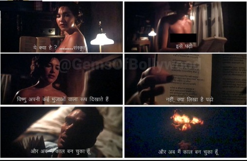 फिल्म में एक सेक्स वाले दृश्य में दिखाया गया है कि अभिनेता लड़की को भगवद्गीता पढ़ने के लिए देता है। युवती पूछती है कि ये क्या है? इस पर वो बताता है कि ये संस्कृत में है। इसके बाद वो इसे पढ़ने के लिए कहता है। इसके बाद वो ग्रन्थ का वो हिस्सा पढ़ती है, जिसमें भगवान श्रीकृष्ण अपने विष्णु के रूप में अर्जुन को अपना विकराल स्वरूप दिखाते हैं। इसके बाद अभिनेता युवती को आगे पढ़ने के लिए कहता है।