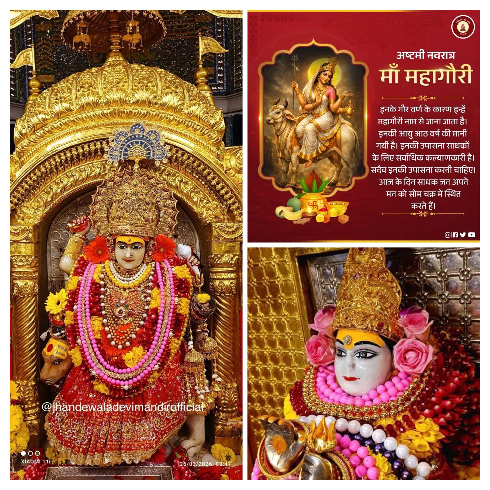 नई दिल्ली। नई दिल्ली स्थित प्राचीन एवं ऐतिहासिक झण्डेवाला देवी मंदिर में आज शारदीय नवरात्र के आठवें दिन माँ के आठवें स्वरूप “माँ महागौरी’’ का श्रृंगार व पूजा अर्चना पूर्ण विधि-विधान के साथ की गई l इनका वर्ण पूर्णता गौर है l इनकी गौरवर्ण की उपमा शंख, चंद्र, और कुंद के फूलों से की जाती है l इनकी आयु आठ वर्ष की मानी गयी है l इनके समस्त वस्त्र एवं आभूषण आदि भी श्वेत है l इनकी चार भुजाएँ है। इनका वाहन वृषभ है।